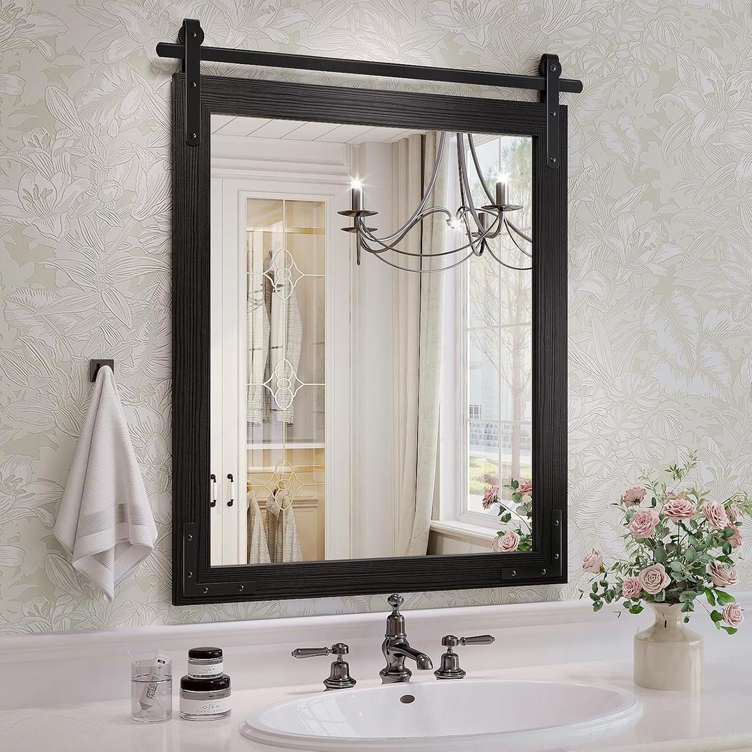 Black Farmhouse Bathroom Mirror, 24x32 Inch Black Vanity Mirror for Wall, Wood Framed Rustic Mirror Rectangular Wall Decor Mirrors for Entryway Living Room Bedroom