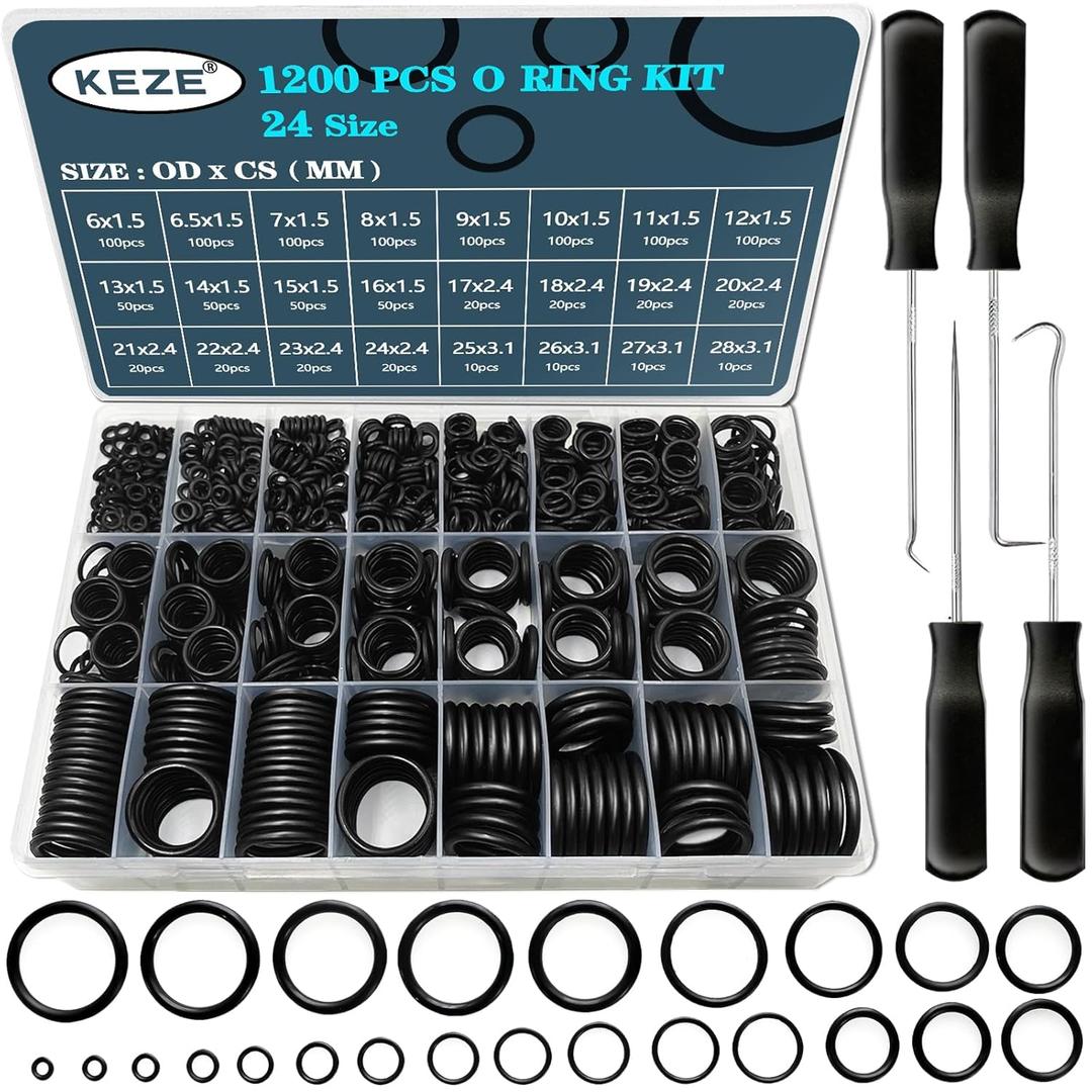 KEZE 1200 Pcs 24 Size Universal Rubber O-Ring Assortment Kit with 4-Piece Precision Pick and Hook Set for Auto Vehicle Faucet Plumbing Pressure Washer Air or Gas Sealing Repair OD:6mm-28mm O Ring