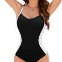 Century Star One Piece Swimsuit Women Slimming Tummy Control V Neck Modest Bathing Suit Full Coverage Swimming Suits Swimwear (Small, Black Colorblock)