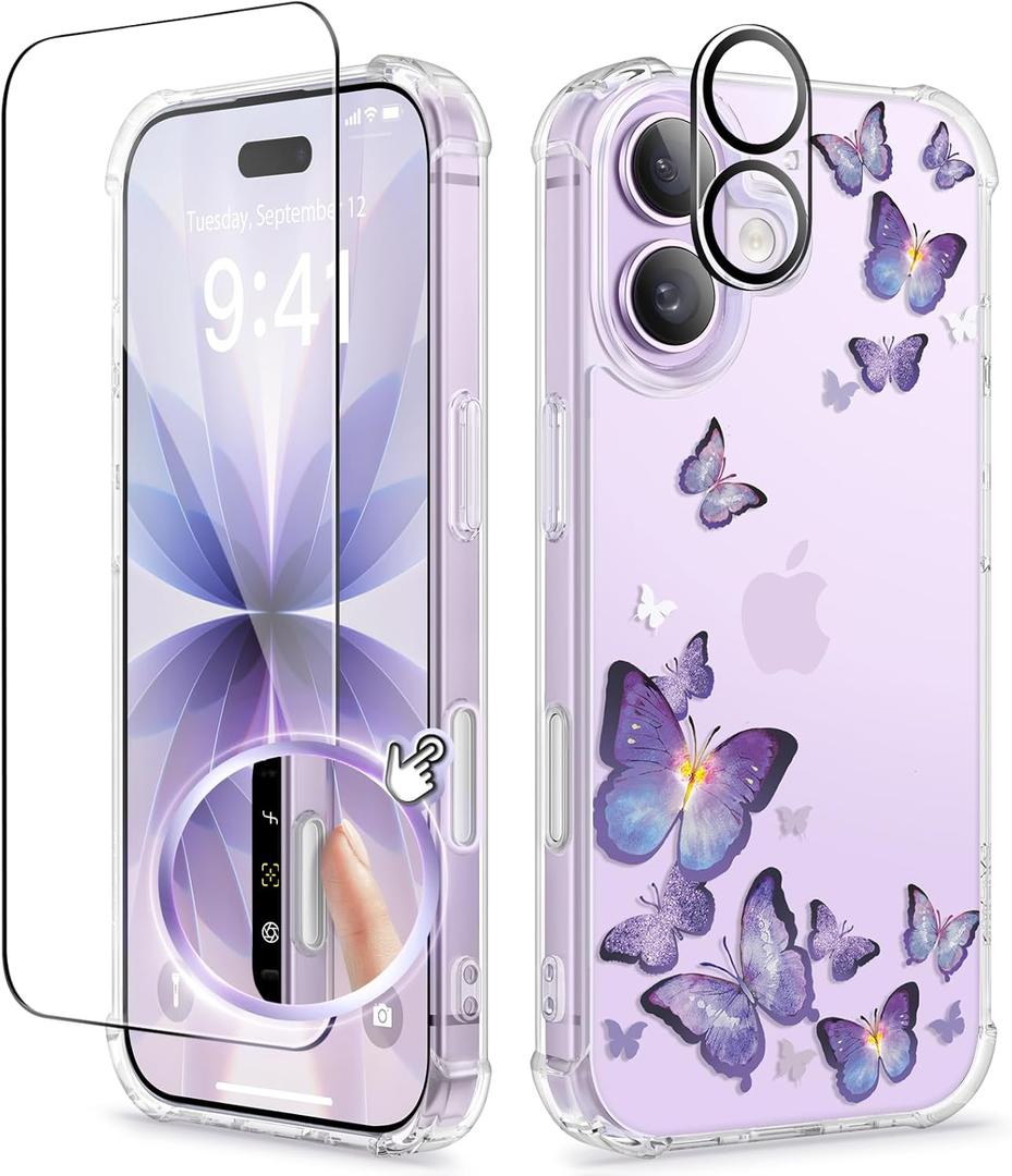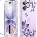GVIEWIN for iPhone 17 Case, with Screen Protector+Camera Lens Protector, [NonYellowing] Clear Floral Slim Shockproof Protective Hard PC Back Women Phone Case for iPhone 17 6.3", Alluring Butterfly
