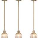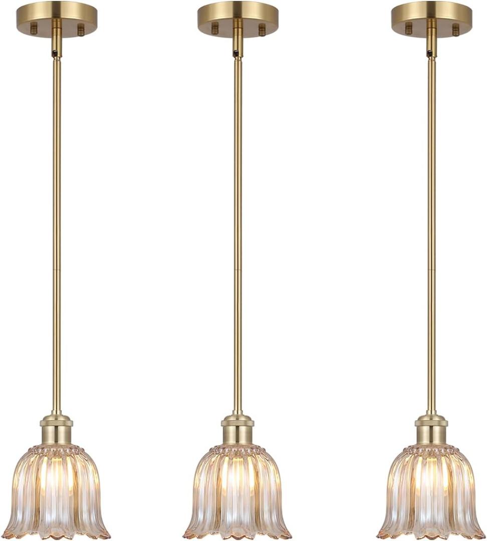 Modern Gold Pendant Light 3 Pack Brushed Brass Mid Century Chandelier Amber Glass Shades Adjustable Rods Farmhouse Ceiling Hanging Lighting Fixture Kitchen Island Dining Room Bedroom