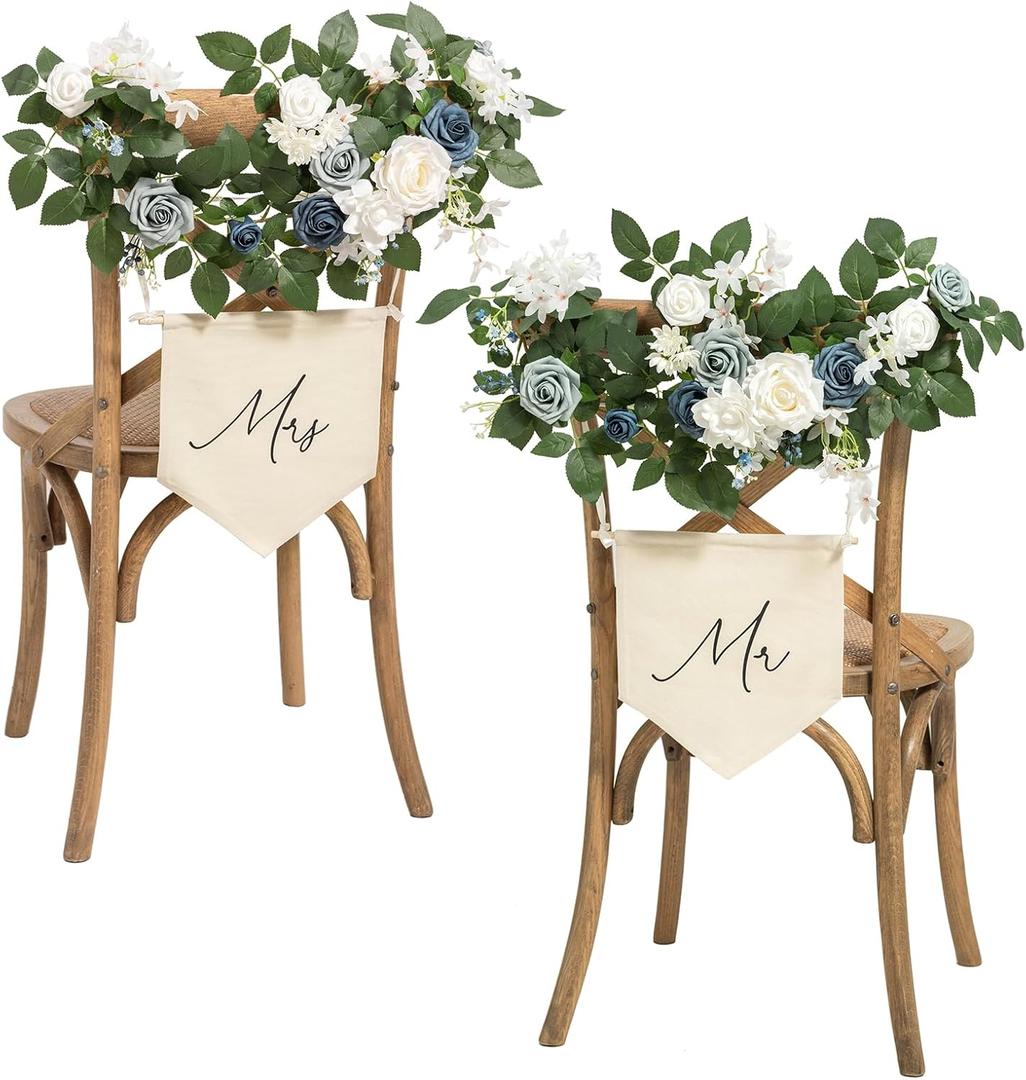 Ling's Moment Mr and Mrs Sign, Bride and Groom Chair Sign for Wedding Chair Decor, 2 Pack Artificial Flower Garland for Wedding, Party, Home Centerpiece Table Decorations (Dusty Blue & Navy)