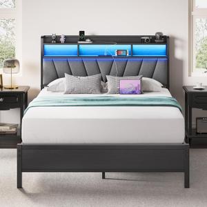 Full Upholstered LED Bed Frame with 2 Storage Drawers and Adjustable Chic Double Wavy Headboard, Velvet Prince Platform Bed with Charing Station, Solid Wood Slats Support, No Box Spring Needed, Grey