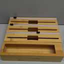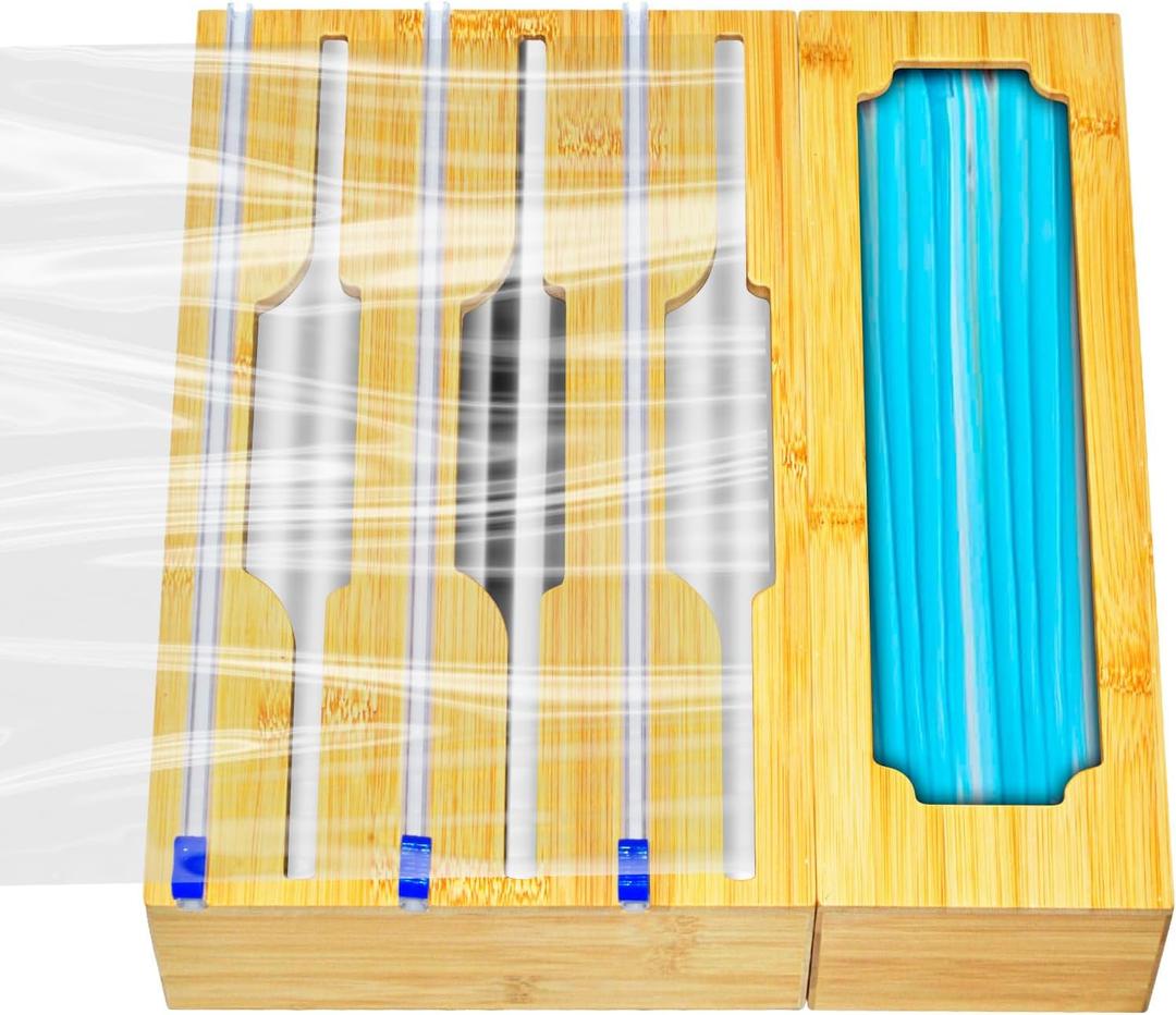 4 in 1 Wrap Organizer with Cutter and Labels, 12" Roll Plastic Wrap, Aluminum Foil, Wax Bamboo Dispenser and Clip Box, for Kitchen Drawer Storage Organization Holder