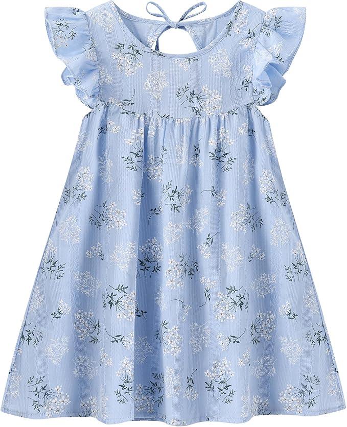 Toddler Girls Ruffle Sleeve Cotton Linen Dress Sleeveless Baby Girl Back Tie Dress Kid Casual Sundress, Size 110 , Blue Floral