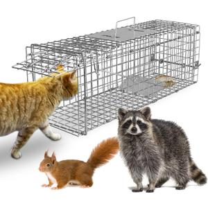 • KOCASO Live Animal Trap Cage, Large Foldable Galvanized Steel Humane Animal Cage Trap, Heavy Duty Metal Trap Cage for Small Stray Cat Raccoon Groundhog Squirrel Chipmunk Mole Gopher Skunk 24"x7.5"x8"